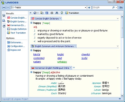 Позволяет работать с более 60 языками мира, среди которых присутствуют следующие языки: английский, испанский, французский, немецкий, русский, японский, эсперанто и многие другие. Между всеми поддерживаемыми языками возможно выполнение перекрестного перевода. Программа интегрируется в операционную систему, предлагая мгновенный перевод слов при простом наведении на них курсора мыши, а также при копировании слов в буфер обмена. В Lingoes Translator присутствует функция произноше