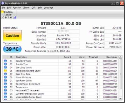 Отслеживает состояние жестких дисков, поддерживающих технологию S.M.A.R.T. Производит мониторинг и дает общую оценку "здоровья" вашего диска. CrystalDiskInfo отображает детальную информацию о жестких дисках, установленных в компьютере (прошивка, серийный номер, стандарт, интерфейс, общее время работы и др.), а также выводит параметры атрибутов системы самодиагностики S.M.A.R.T. (ошибки чтения, производительность, запуски/остановки шпинделя, время поиска дорожки, количество цик
