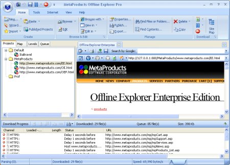 Программа, позволяющая скачивать веб-сайты на жесткий диск для их последующего офф-лайн просмотра. Имеет встроенный web-browser и web-сервер для улучшения локального просмотра. Offline Explorer отличается удобным и гибким интерфейсом пользователя и наиболее широким списком поддерживаемых Web технологий: различные прокси-сервера, cookies, встроенный Web-browser и Web сервер для улучшения локального просмотра. Он может распознавать и загружать ссылки из HTML файлов, Java- и VB-