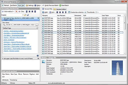 Advanced Renamer is program for renaming multiple files or folders at once. It can use several different methods for calculating the new name including multimedia tools for sound and picture files. Advanced Renamer makes it easy to set up an advanced batch job using multiple methods on a large amount of files. The eight different methods make it possible for you to change the names, attributes and timestamps of files in one go. With Advanced Renamer you can construct new file names by adding, removing, replacing, changing case, or giving the file a brand new name based on known information about the file.