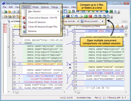 Compare Text Files and Folders with UltraCompare Professional. A complement to your file management suite, UltraCompare Professional is loaded with features to enable you to compare text files and folders, as well as zip files and jar archives. Text file compare features include binary and text compare of two or three text files at a time, with the ability to merge text differences between compared files. Folder compare supports comparison of local/network directories (and subdirectories with recursive folder compare) and zip file compare as well, and like text/binary compare, you can merge differences between compared directories.