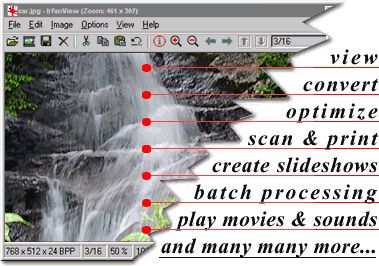 Очень быстрая, маленькая и современная программа просмотра графики для Windows. IrfanView пытается быть простым для начинающих и мощным для профессионалов. IrfanView пытается создавать новые и интересные функции, в отличие от некоторых других программ просмотра, чья "креативность" основана на клонировании функциональности, краже идей и даже целых диалогов из ASDSee и/или IrfanView. IrfanView был первой программой просмотра для Windows в мире с поддержкой анимированных GIF файлов. Поддержка множества форматов файлов. Слайдшоу (возможность сохранения слайдшоу как EXE/SCR и записи на CD). Эффекты (четкость, размытие, Adobe 8BF, Filter Factory, Filters Unlimited и т.д.)